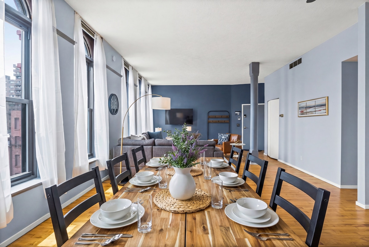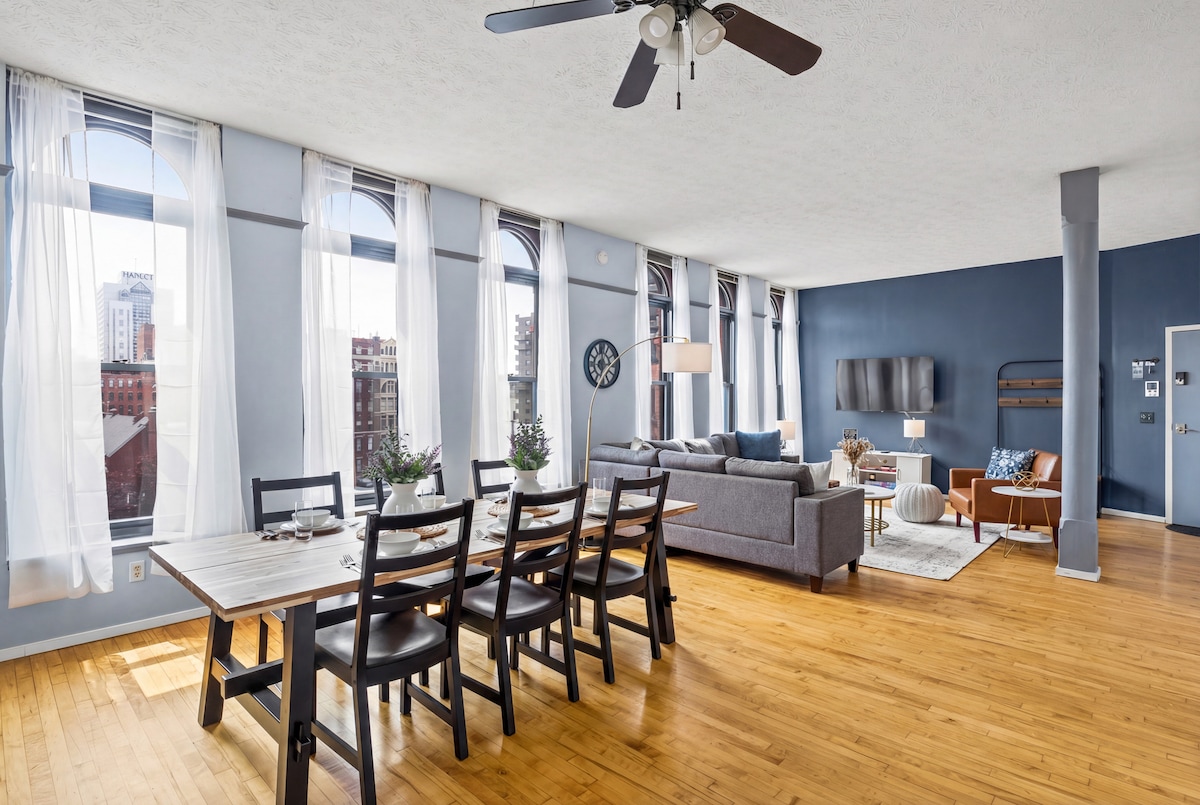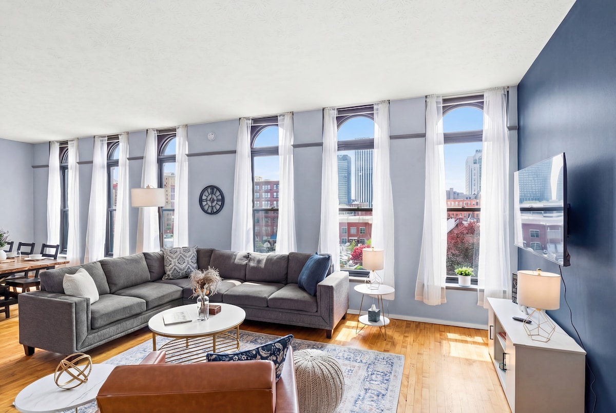 Stay in the heart of the city and experience the best food, business and entertainment nearby. With skyline views, and abundance of space and classic hardwood floors, this loft has everything you need.
